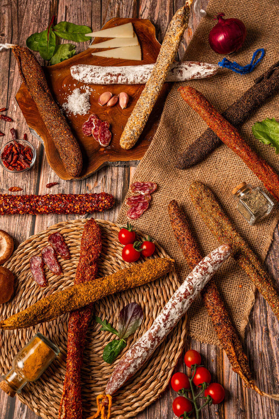 Nuestro catálogo incluye una amplia variedad de fuets artesanales, con combinaciones originales que van desde ingredientes clásicos hasta propuestas innovadoras con quesos, frutos secos, hierbas aromáticas o especias del mundo. Cada pieza está pensada para ofrecer una experiencia gastronómica única, con carácter propio y equilibrio de sabor.