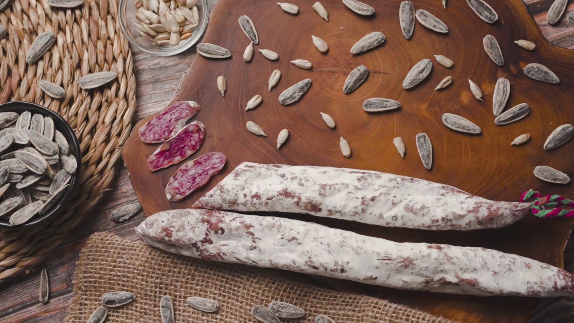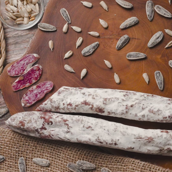 Nuestro fuet de pipas es una combinación única que fusiona la suavidad del embutido curado con el crujiente y delicioso toque de las pipas de girasol. Cada bocado ofrece una textura inigualable y un sabor equilibrado, donde la intensidad de la carne se mezcla a la perfección con el ligero tostado de las pipas.